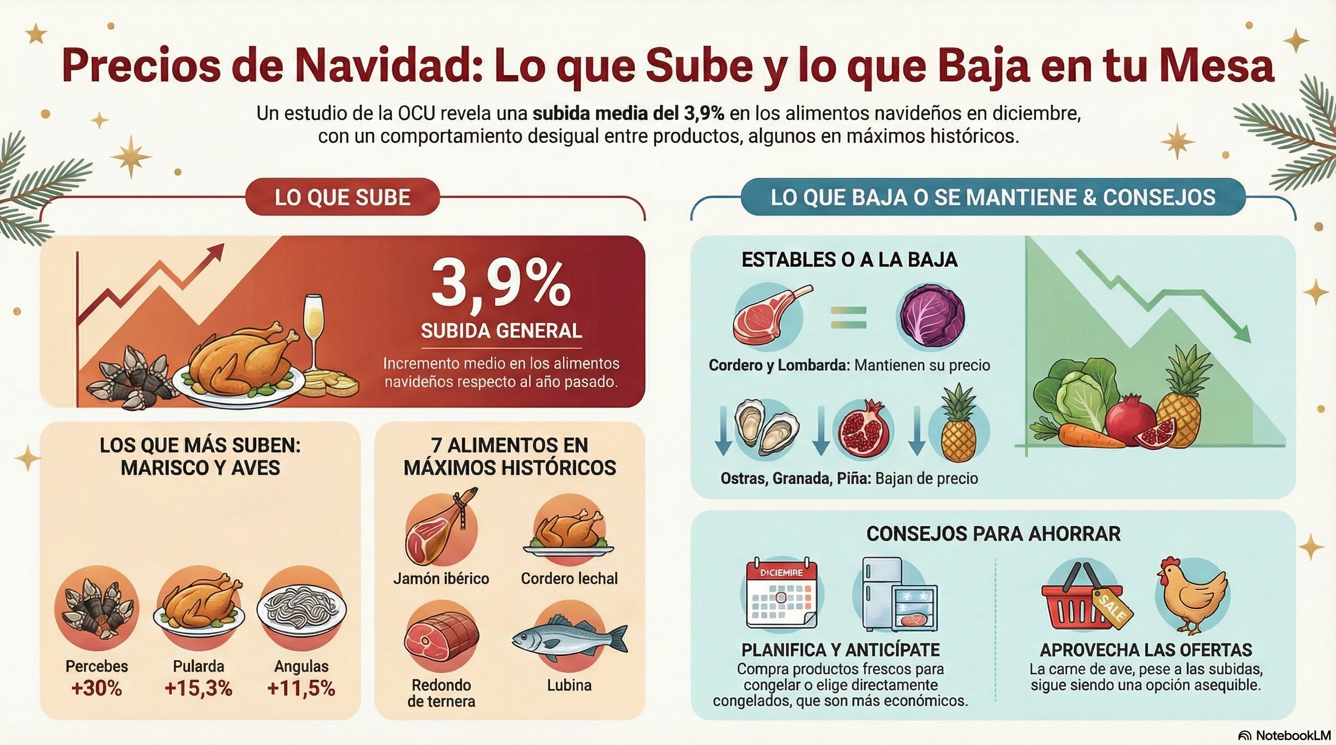 También registran subidas el pavo entero, el redondo de ternera, la merluza al corte, la lubina, las almejas, los langostinos, el besugo y el jamón ibérico de cebo, aunque en estos casos los aumentos son más moderados. Por el contrario, mantienen su precio el cordero y la lombarda, mientras que bajan las ostras, la granada y la piña.
