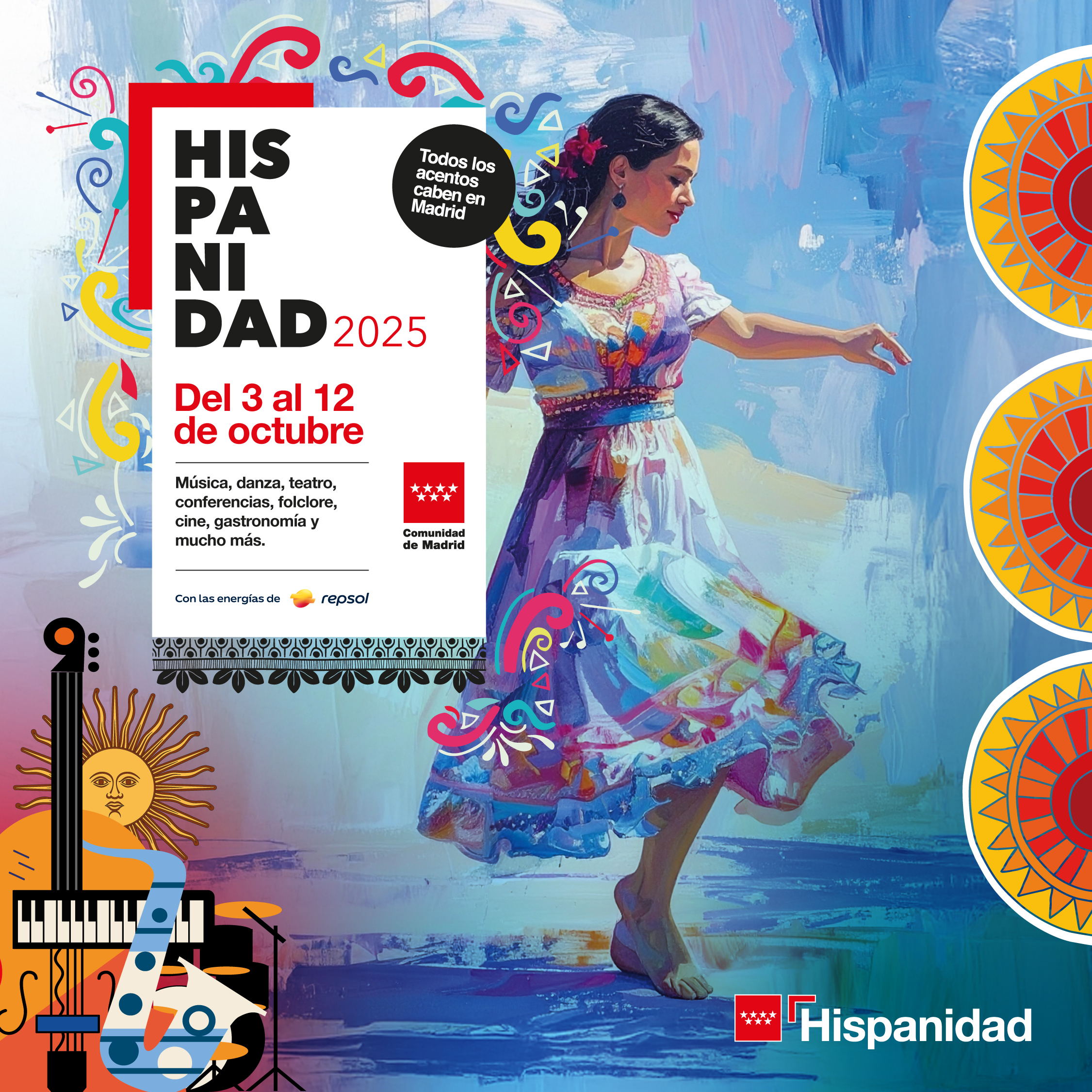 La Comunidad de Madrid se prepara para celebrar del 3 al 12 de octubre las fiestas de Hispanidad 2025, una cita que en tan solo cinco ediciones se ha consolidado como uno de los grandes encuentros internacionales de la cultura en español. Bajo el lema “Todos los acentos caben en Madrid”, este evento ofrecerá más de 200 actividades gratuitas en cerca de 70 escenarios repartidos por toda la región, con la participación de artistas de 23 nacionalidades que llenarán de música, literatura, cine, danza, folclore y artes escénicas los principales espacios de la capital y sus alrededores.